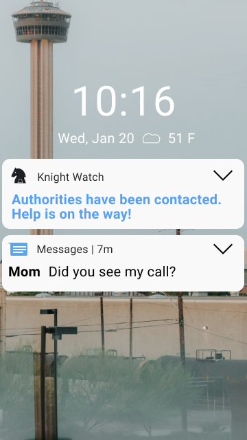 Knight Watch was inspired by my experience of living on the West Side of San Antonio. When I was a young college student who would walk alone to get to my car, I would often feel a sense of danger. For many, when dangerous situations arise, the ability to silently and quietly alert others is not available. Knight Watch is a mobile app paired with a smartwatch app, that provides a reliable, quick way to alert authorities and loved ones while also providing a sense of comfort.