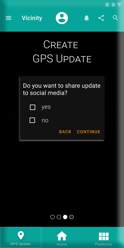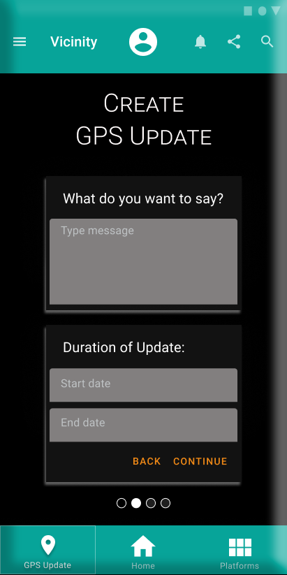 After the user created their account, they would be able to send out a notification using geofencing through a simple icon on the bottom navigation. The process of sending out a notification was kept to a four-step solution that allowed the user to put in the necessary information, while also having the option to use the same information to make a social media post. Combining the two types of posts/notifications saves time for the busy small-business owners.